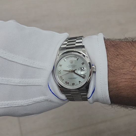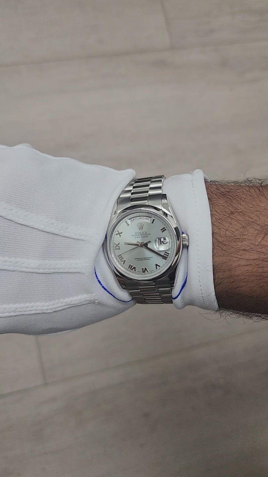 | Dial | Rolex Glacier Roman Dial with the day at the 12 o'clock and the date at the 3 o'clock |