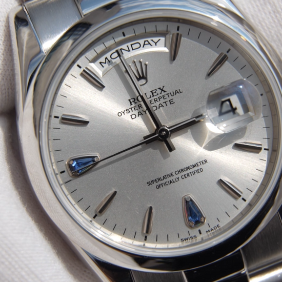 This rare 118206 Day-Date features a platinum case and President bracelet, with a factory teardrop sapphire dial — a stunning and unusual configuration in the 36mm format.